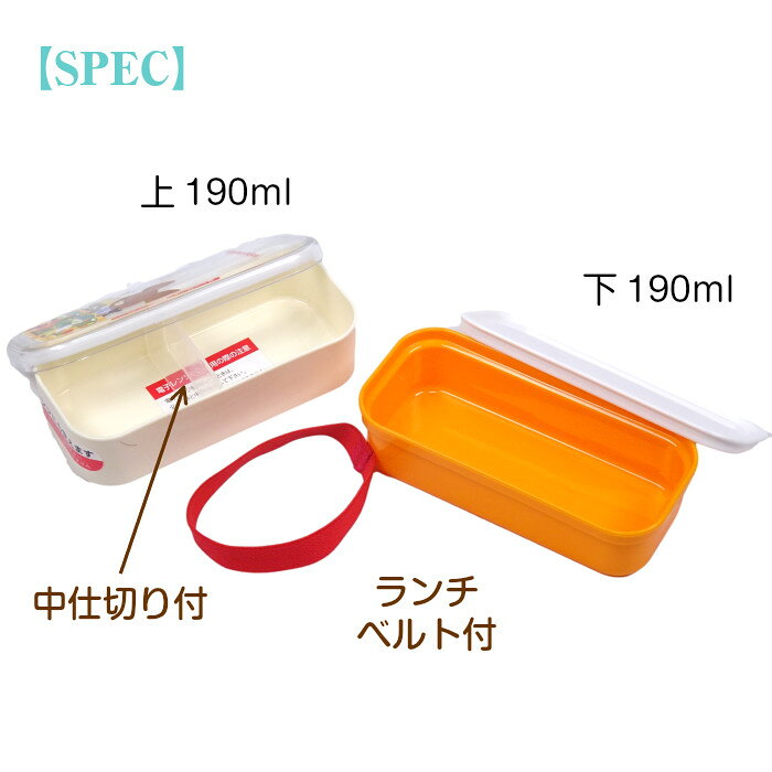誕生日プレゼントや入学祝などのプチギフトにも 同シリーズで柄違いや箸・トリオセット・巾着なども取り扱ってます! ランチベルト付き サイズ:上190ml 下190ml タテ7×ヨコ14.6×高さ8cm 素材:フタ/AS 本体・中フタ・中仕切り/PP パッキン/シリコンゴム(電子レンジ可フタ×) コンパクト収納!日本製 他にも弁当箱! 【発送詳細】 ※ゆうパケット不可 宅配便発送になります。